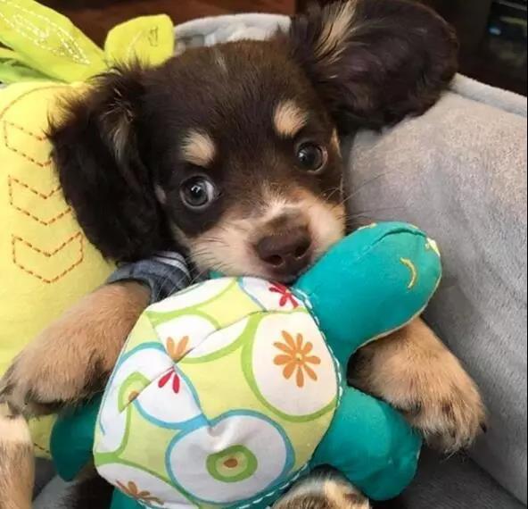 只見狗狗乖乖的躺在它的小床上,枕著枕頭,抱著玩具,頭上還夾著小發(fā)卡,像個小寶寶。